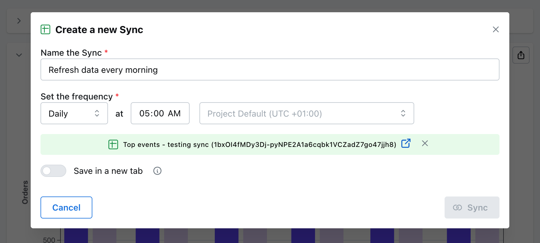 The pop-up shows you a list of any existing Syncs for the saved chart, you also have the option to Create new Sync. Clicking Create new Sync takes you to the configuration screen to setup a new Google Sheets Sync.